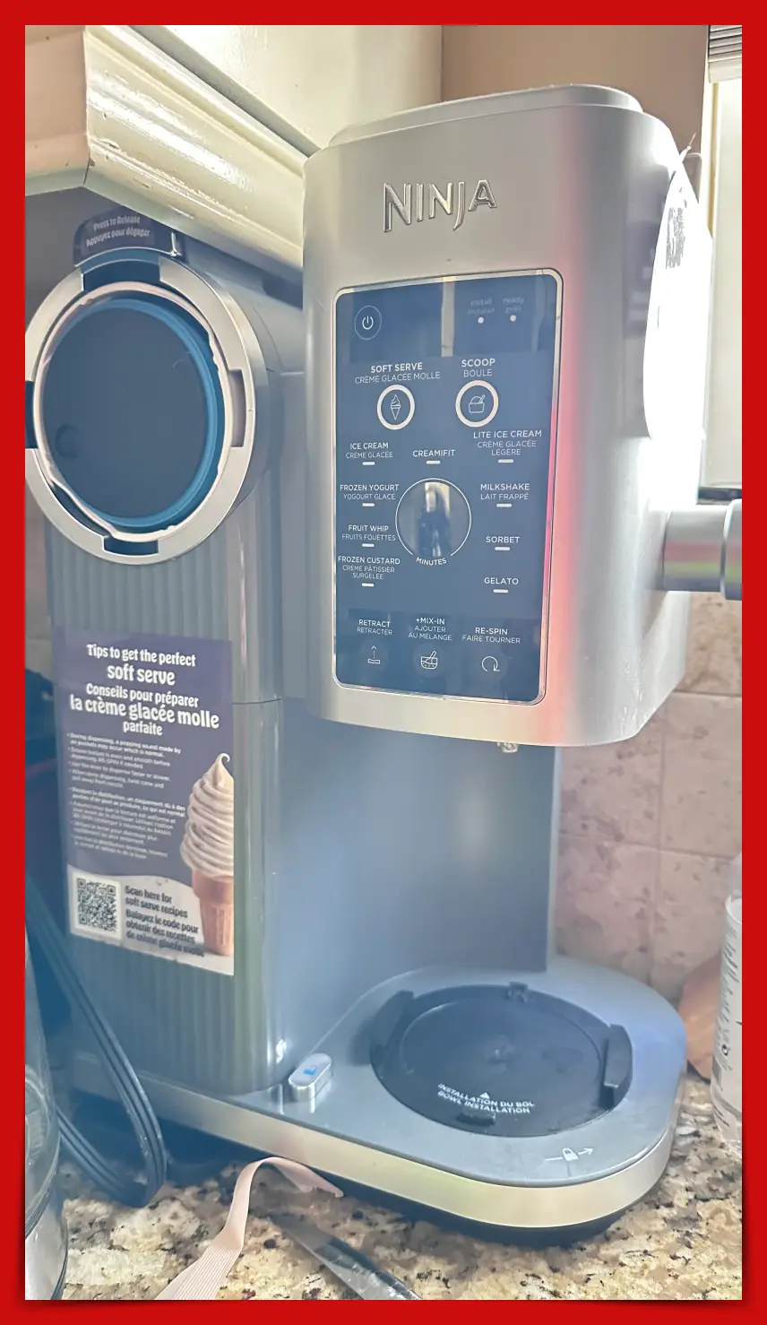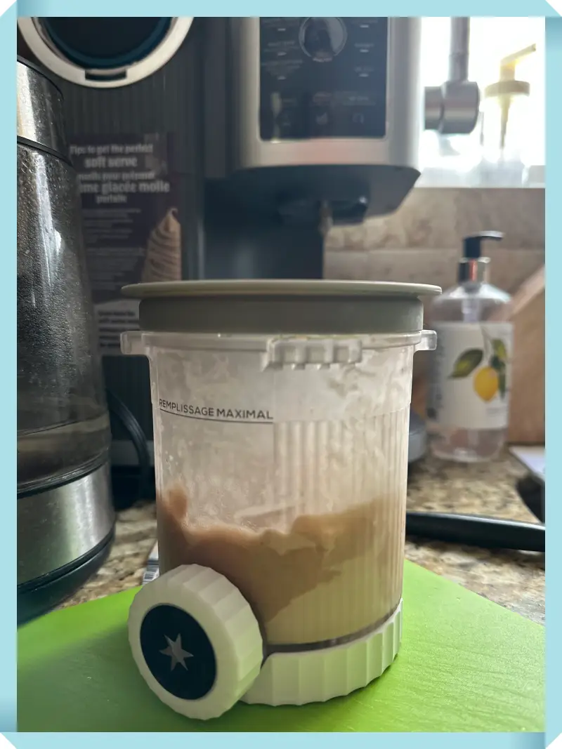 전날 미리 만들어 둔 재료를 닌자 아이스크림 메이커에 돌리면 4분만에 쫀득한 아이스크림을 만들 수 있어요